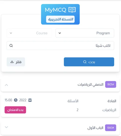 استخدم المرشحات الذكية لاكتشاف الاختبارات والامتحانات التي تناسب تخصصك ومستواك وأهدافك. سواء كنت تراجع للدراسة أو تستعد للامتحانات الوطنية، يساعدك MyMCQ على التركيز تمامًا على ما يهمك. صفِّ النتائج حسب الموضوع أو مستوى الصعوبة أو الوسوم لتحصل على مجموعات تدريب مخصصة في ثوانٍ، مصممة لتواكب وتيرة تعلمك وأهدافك. استكشف أسئلة أعدها معلمون، منظمة حسب المنهج، ومدعومة بتوصيات ذكاء اصطناعي تتكيف مع تقدمك. مع MyMCQ أنت لا تتدرب فحسب، بل تتدرب بذكاء.